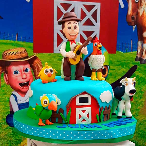 Torta hecha en queque de vainilla, rellena con manjar blanco y cubierta en masa fondant. Con piezas modeladas finamente en masa de azúcar.